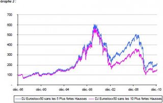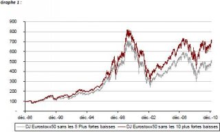 Finally, one of the basic rule of market timing relies on a clear arithmetic rule: get 1/3 of bear market and 2 / 3 of bull market are enough to generate significant gains over the long-term. Illustration with the history data of the DJ EuroStoxx 50. By avoiding the five largest declining sessions, an investor "A " who invested 100 euros at the index creation in early January 1987, has its invesment valued at 498 euros in February 22, 2011. Better, It would have been valued at 696 euros by avoiding the ten largest declining sessions. For comparison, the investment of an investor "B" who held investment over the entire period is valued only at 331 euros. Of course, the risk is to miss strong bullish sessions (cf. Graphe 1). By being out of the market during the five largest gains sessions, an investor "C" gets 207 euros. And only 148 euros being out for the top 10 sessions (cf. Graphe 2). To generate performances and stand out from the market, it is necessary to practice active management based on fundamental and technical approaches, in order to find entry and exit points.