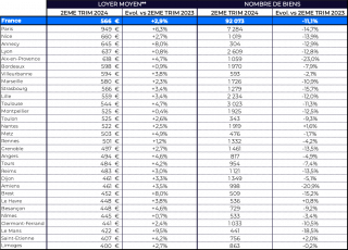 En moyenne, les loyers des studios ont progressé de +2,9% en 1 an, mais cette tendance cache des disparités. En tête des villes principales dans lesquelles le budget mensuel pour un studio a le plus progressé, on note Le Mans à +9,5% par rapport au 2ème trimestre 2023, suivi de Brest et Annecy à +8,0%, et bien entendu Paris, à +6,3%. À l’inverse, c’est à Montpellier qu’il a le moins augmenté avec un loyer quasiment stable (+0,4% en 1 an), tout comme à Lyon (+0,8%) et Bordeaux (+0,9%).