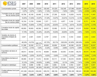 Ce sont évidemment la consommation et l’investissement, ou formation brute de capital fixe, qui sont principalement réduits par les nouvelles mesures d’austérité, et par l’incertitude qui a prévalu depuis novembre de l’année passée. Les contrôles de capitaux, qui ont raréfié la liquidité et inquiété les investisseurs, ont également ralenti les dépenses privées. Les exportations, essentiellement celles de services touristiques, continueraient toutefois à croître de manière dynamique et amoindriraient la récession. Certains organismes publient des perspectives plus pessimistes car elles supposent une stagnation ou même une réduction des exportations mais ce scénario semble exagéré compte tenu de l’information disponible.